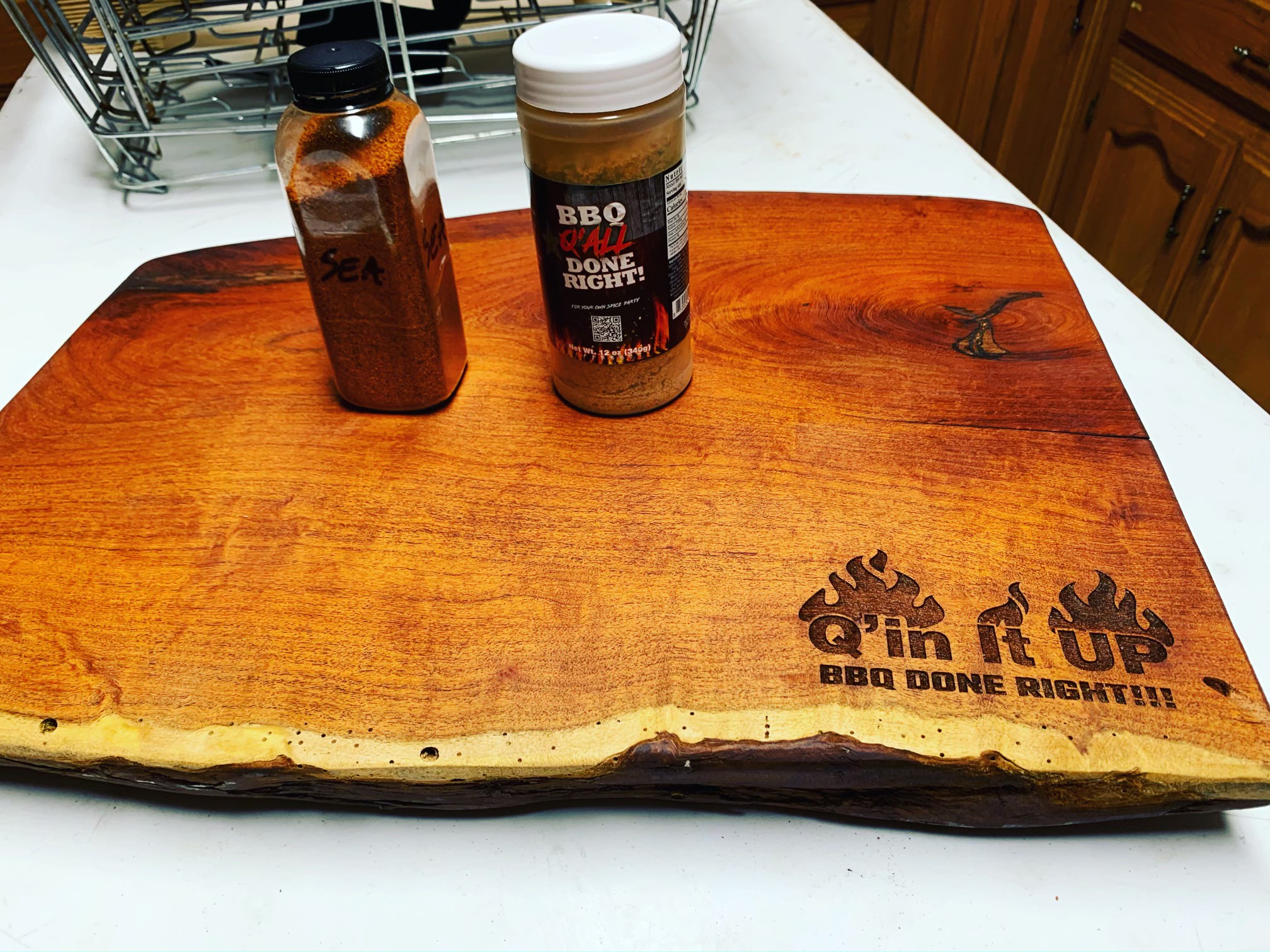 100% Texas Mesquite Wood Cutting Board. Great for cutting all your meats and vegetables. This package comes with 2 spices.